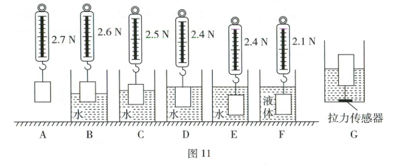 (3)浸在液体中的物体所受的浮力等于其上下表面受到液体的压力差(F浮 = F向上 - F向下),图C中物块的上表面未浸入水中(即上表面受到的液体压力为0),则其下表面受到的液体压力F向上 = F浮 = FA - FC = 2.7N - 2.5N = 0.2N。