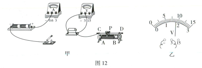 18. (7分)如图12甲是“探究电流与电压、电阻关系”的实验电路,三个小组的同学分别用5Ω、10Ω、15Ω的定值电阻和几节电池串联的电池组(电源电压是1.5V的整数倍且不超过4.5V)进行探究。
