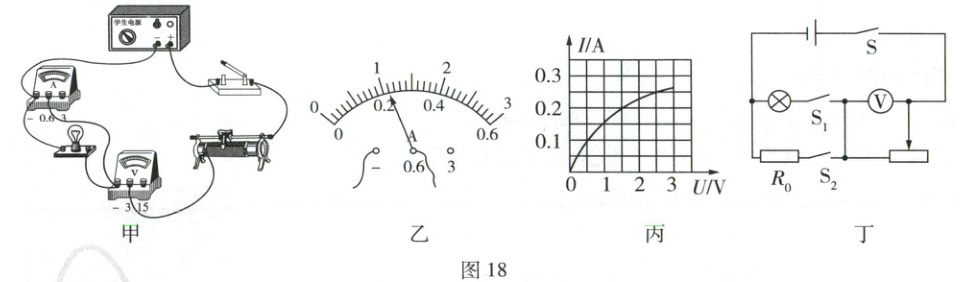 (4)接下来小明拿走电流表,增加两个开关和一个定值电阻R₀,利用如图18丁所示的电路,测出了另一个额定电压为Uₙ的小灯泡正常发光时的电阻。实验步骤如下:
