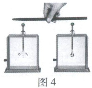 6. 先用丝绸摩擦过的玻璃棒接触不带电的验电器甲,发现验电器甲的金属箔片张开;然后用硬棒将验电器甲与不带电的验电器乙连接起来,如图4所示,发现验电器甲、乙的金属箔片张角不变。下列说法正确的是 (