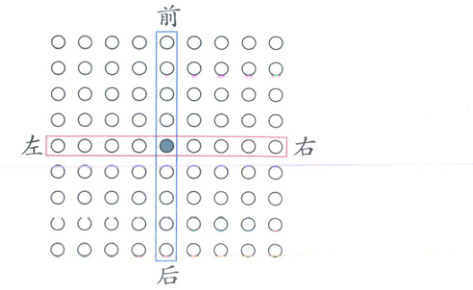 如上图所示,小玲的前后左右各有4(名)同学,则军训的同学共有:4×4+1=17(名)。