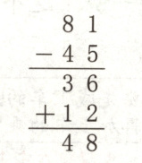 错解分析 错解错在计算81 - 45时,个位上1减5不够减,向十位借1,计算十位时,忘记减去十位上被借走的1。计算两位数减法时,个位上不够减要向十位借1,计算十位时,不要忘记减去被借走的1。
