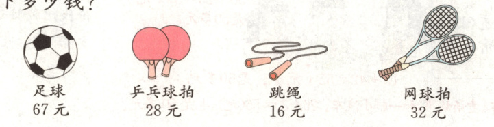 说明应该买足球和网球拍。再用100减去买这两件物品花费的钱数,计算出剩下的钱数即可