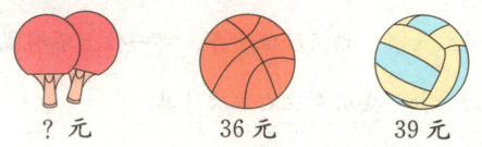 $\begin{array}{l}一副乒乓球拍\\的价钱\end{array}=\begin{array}{l}乐乐花\\的钱数\end{array}-\begin{array}{l}一个篮球\\的价钱\end{array}-\begin{array}{l}一个排球\\的价钱\end{array}$
