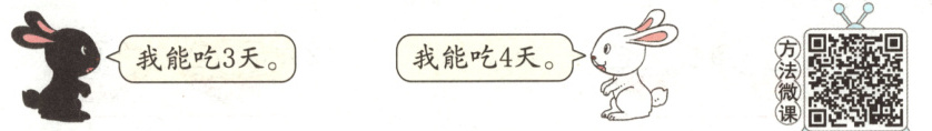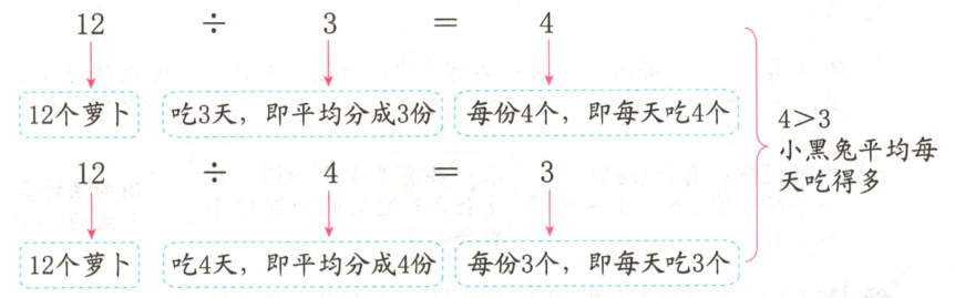 3. 培优题 小黑兔和小白兔各有 12 个萝卜。谁平均每天吃得多?