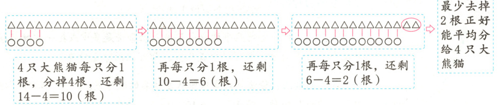 (1) 把 14 根竹子平均分给 4 只大熊猫,可以先 1 根 1 根地分,看最后剩下几根,就去掉几根。用 1 个△代表 1 根竹子,用 1 个○代表 1 只大熊猫。