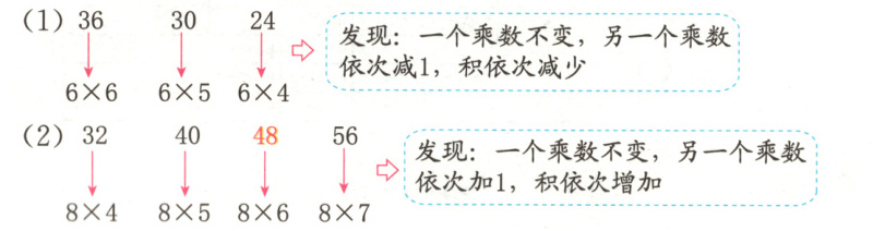 (2) 32 40 48 56 $\xrightarrow{}$ 发现:一个乘数不变,另一个乘数依次加 1,积依次增加