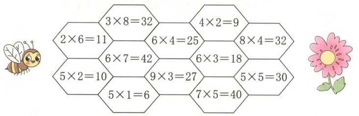 2.提示:得数正确的算式依次是5×2=10,6×7=42,9×3=27,6×3=18,8×4=32。