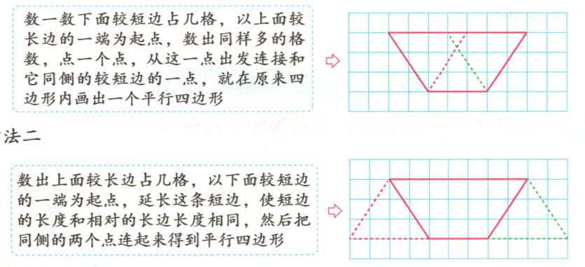 数一数下面较短边占几格, 以上面较长边的一端为起点, 数出同样多的格数, 点一个点, 从这一点出发连接和它同侧的较短边的一点, 就在原来四边形内画出一个平行四边形
