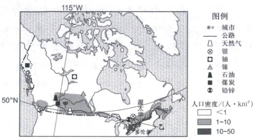 D 乙地位于五大湖沿岸平原,海拔较低,且若海拔较高,则热量条件较差,不利于人口分布 错误
