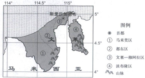 (2025天津期末)文莱位于加里曼丹岛北部,全国共有四个行政区,被马来西亚的沙捞越州分隔为不相连的东西两部分,东部地势较高,西部多沼泽,首都斯里巴加湾是文莱最大城市。文莱森林茂密,覆盖率为72.11%。下图示意文莱四个行政区分布。据此完成6~7题。