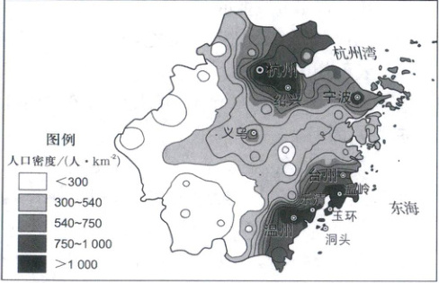(高频考向(2025辽宁联考)浙江省位于我国东南沿海,境内环杭州湾地区地形以平原为主,西南和中部地区以山地丘陵为主。下图示意浙江省人口密度分布。据此完成1~3题。