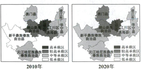 下图为 2010 和 2020 年云南省玉溪市各县区资源环境承载力空间分析结果图。据此完成 3~4 题。