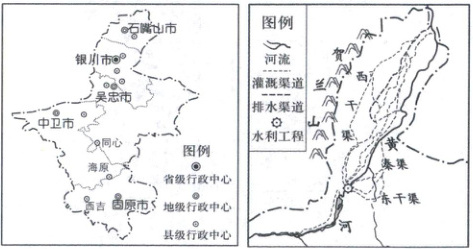 材料二 “西海固”是西吉、海原和固原首字的简称,地处宁夏南部山区,是革命老区、贫困山区和少数民族聚居区,是国家确定的 14 个集中连片特困地区之一。该区域山大沟深,年均降水量仅 300 mm,蒸发量却在 200 mm 以上。1972 年西海固地区被联合国世界粮食计划署确定为全球最不适宜人类居住的地区之一。1982 年宁夏开始实施生态移民工程,将居住在西海固生态环境日益恶化地区的居民,分期分批迁移到生态环境和生存环境相对良好的宁夏北部。2020 年 11 月 16 日宁夏回族自治区政府宣布固原市西吉县退出贫困县序列,这标志着曾有“苦甲天下”之称的西海固地区全部“摘帽”,从此告别绝对贫困。下图为宁夏回族自治区政区图和宁夏北部水系图。