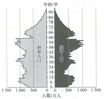 某学者以 2010 年常住人口为基础,在不考虑城乡人口迁移的条件下,测算出 2020 年我国乡村各年龄段常住人口数量。下图示意 2020 年我国乡村常住人口的测算结果与统计结果。据此完成 3~4 题。