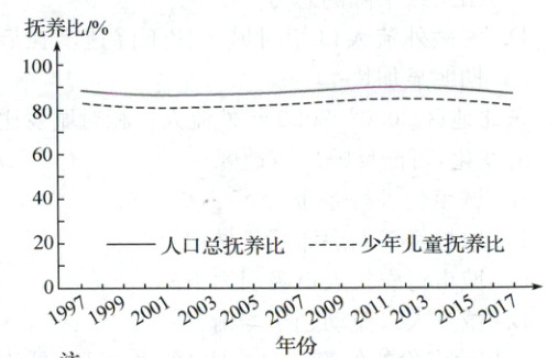 下图示意某人口大国 1997—2017 年人口总抚养比和少年儿童抚养比的变化。据此完成 5~6 题。