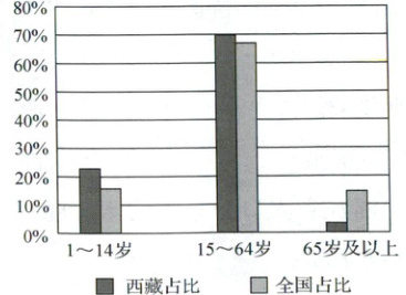 (2025吉林长春期末)西藏是我国人口十分稀少和少数民族人口聚居程度很高的民族自治地区,这些因素的叠加效应使得西藏人口再生产和人口分布有着鲜明的地域特征。下图为2020年西藏与全国不同年龄人口比例示意图。据此完成12~13题。