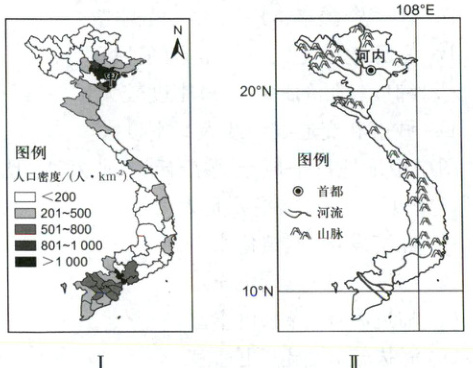 (2025陕西渭南期末)越南位于中南半岛东部,国土面积约330 000 km²²,虽面积不大,却划分为63个省级行政区。越南为东南亚第三人口大国,第5次人口普查(2019年)显示,越南总人口为9 620.9万人,境内人口分布不均,如Ⅰ图所示。数据显示,2023年,越南外出务工人数约为15.5万人,同比增长8.55%,创历史最高水平。