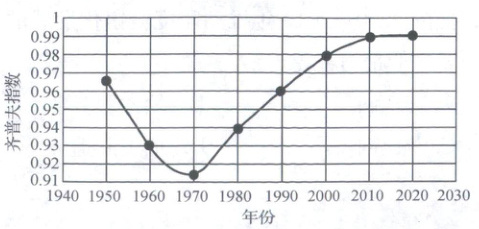 (2025 广东联考)齐普夫指数用来反映城市人口分布的集中程度,数值越小,人口分布越集中。埃塞俄比亚位于东非高原,城市具有“向高而建”的特点,多数城市海拔超过 3 000 m。下图示意 1950—2020 年埃塞俄比亚城镇体系齐普夫指数变化情况。据此完成 5~7 题。