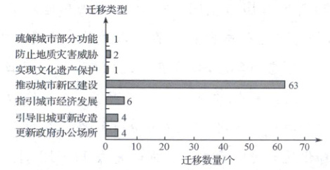 (教考衔接)(2025 河北石家庄期末)行政中心(亦称政府驻地)是政府决策和行政管理的重要场所,其所处的位置通常是城市发展的核心区域,影响着城市整体发展格局。行政中心迁移是典型的政府主导行为,随着城镇化的快速推进和“城市病”问题的逐渐加剧,城市行政中心迁移作为一种城市空间治理与空间结构调整的手段流行起来。下图示意我国地级及以上城市行政中心迁移类型数量统计。据此完成 1~2 题。
