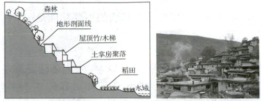 (2025 河北石家庄期末)土掌房为彝族先民的传统民居,距今已有 500 多年的历史,以石为墙基,用土坯砌墙或用土筑墙,墙上架梁,梁上铺木板、木条或竹子,上面再铺一层土,经洒水捶实,形成平台房顶,全村房屋墙连墙,下一家的屋顶即为上一家的场院,层层而上,直达山顶。土掌房主要分布在滇中及滇东南一带。下图示意土掌房地形剖面和景观。据此完成 7~8 题。