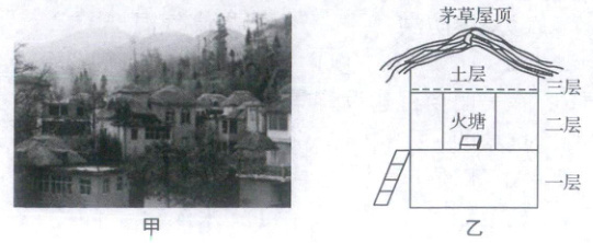 (2025 黑龙江哈尔滨期末)蘑菇房是哈尼族人所居住的特色房屋,房屋状如蘑菇,由土基墙、竹木架和茅草顶构成。房屋分为三层,中层中间设有一个常年烟火不断的方形火塘。哈尼族居住的云南哀牢山垂直差异明显,降雨量较大(一般超过 1200 mm),雾多,日照少。下甲图为蘑菇房景观图,乙图示意蘑菇房构造。据此完成 3~4 题。