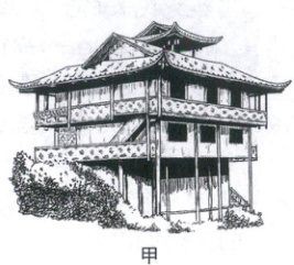 (高频考点)(2025 辽宁大连期末)加车村位于贵州黔东南苗族侗族自治州,村寨内古吊脚楼群、芦笙堂等古建筑保存完好,至今保留着完整的少数民族文化,大、小芦笙堂是村民重要的公共活动场所。甲图为古吊脚楼示意图,乙图为加车村位置与村落布局图。据此完成 1~2 题。
