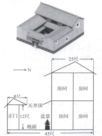 (教材变式)(2025 河南郑州月考)“一颗印”是我国云南某山区居民为适应环境修建的天井式民居,是我国面积最小的四合院。下图为云南某地(24°30′N,103°E)“一颗印”景观及建筑结构侧视图。据此完成 5~6 题。