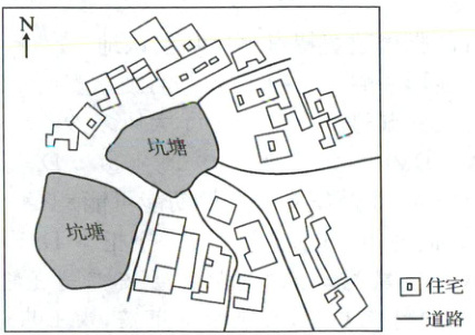 (教材变式)(2025 湖北联考)河南省南部传统村落众多,多为坑塘式村落,年均降雨量 1000 mm 左右,水稻种植业发达。下图示意豫南龚冲村局部平面分布。据此完成 14~16 题。