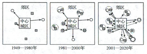 (3)2001—2020 年该城市居住要素和消费要素大量流入郊区,试从中心城区角度推测其原因。