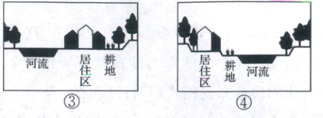 3.C 由图可知,屿北村位于河流一侧,①图中河流两侧都有居住区,不符合题意;屿北村坐落在山麓河谷地带,居民区应靠近河流分布,方便生活用水,而耕地则位于居民区和林地(山地)之间的地势较平坦的区域,③正确,②④错误。故选C。