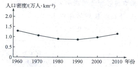 (2025 四川卷)发展较成熟、规模和结构相对稳定的大都市区,空间上通常表现出较明显的圈层结构。下图示意 1960—2010 年某大都市区核心圈层(距老城中心 5km 范围内)的人口密度变化。据此完成 1~2 题。