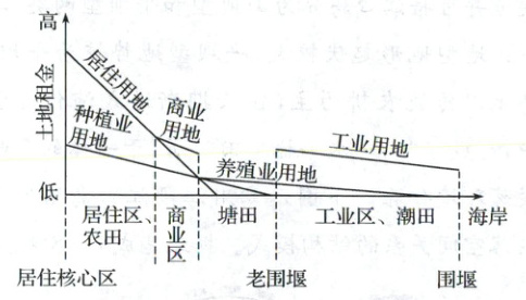 (2025 广东卷)广东沿海某村早期的土地利用,按照海拔由高到低依次为林地、居住用地、耕地和海岸滩涂。随着工业化发展,该村从居住核心区至海岸的土地利用发生明显变化,这种变化与土地利用的地租竞争力相关。下图示意该区段土地利用及其地租竞争力空间分布。据此完成 9~10 题。