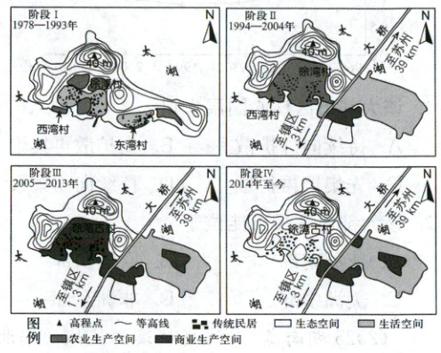 叶山岛位于太湖东南水域、南宋末年就有村民在该岛定居;至清代,岛上居民已达百余家,村民以渔、农为业,皆会唱曲。20 世纪 90 年代以来,随着该岛被纳入太湖国家旅游度假区以及徐湾古村被列入苏州市第一批传统乡村名录,当地居民的生活、生产空间发生了显著改变。近年来,当地政府利用古村落和传统戏剧文化资源发展文旅产业,下图示意 1978 年以来叶山岛生活、生产和生态空间的变化过程。