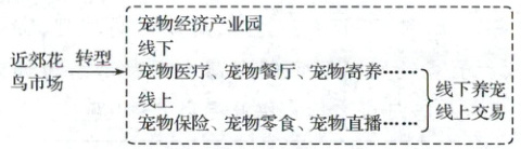 (2025广东江门期末)宠物经济是围绕宠物全生命周期衍生的一系列经济活动总和,包括宠物繁殖、交易、食品、医疗、丧葬等各环节。南昌的J花鸟市场地处城市近郊,由于经济环境的改变,花鸟市场向宠物经济产业园转型,并探索“线上交易+线下养宠”模式。下图示意J花鸟市场的运营模式。据此完成9~11题。