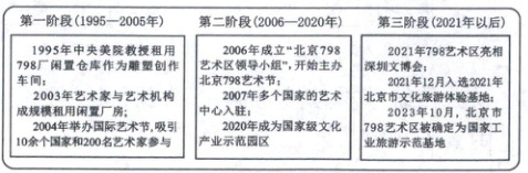 (2025 山东联考)随着改革开放的深入发展,我国文化创意产业经历了从无到有、从小到大的发展历程。北京 798 艺术区前身是北京华北无线电联合器材厂的 798 厂房,后逐渐发展成北京朝阳区的艺术地标。下图示意 798 艺术区发展历程。据此完成 6~8 题。