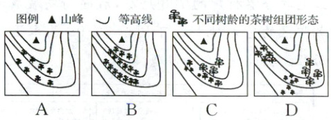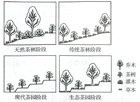 生态茶园阶段,茶地景观平面上打破了现代茶园单调的格局,在茶园里套种其他树木和草本植物;立面上恢复传统茶园的乔、草双层结构,图A符合特征,A正确。