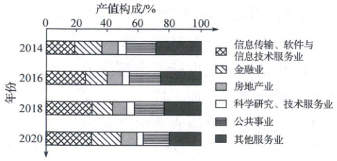 (2025 四川卷)信息传输、软件与信息技术服务业属于数字经济核心产业。2000—2020 年,杭州市的数字经济企业由 0.27 万个增长至 14.24 万个,是长三角数字经济增长极之一。数字经济企业核心集聚区 2011 年前为西湖区,2011—2015 年为西湖区、滨江区,2015 年后为滨江区、西湖区和余杭区。下图为 2014—2020 年杭州市服务业产值构成图。据此完成 1~2 题。
