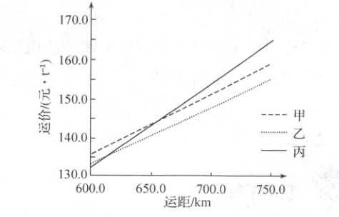 (教考衔接(2025 江西赣州期末)某企业距货运火车站 20 多千米,在综合比较了铁路罐车(罐与车身一体,单车载重量最大)、铁路罐箱(类似于集装箱,便于装卸)和公路货车在运输某种液态原料的部分运距—运价关系(下图)及运输便捷性后,选择了铁路罐箱为主要运输原料方式。据此完成 4~5 题。