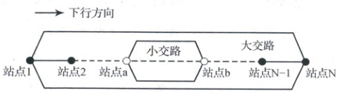 (2025 湖南联考)大小交路是指城市轨道交通列车在线路上的运行距离有长、短路两种方式,在线路的部分区段共线运行,采用大小交路运行是为了缓解客流压力。在规定时间内大交路发车频次较低,小交路发车频次较高。下图为线路及大小交路示意图。据此完成 1~3 题。