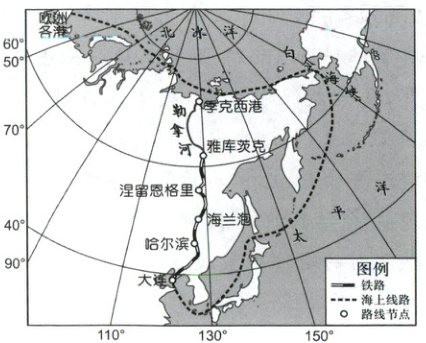 (变式探究(2025 江西抚州期末)勒拿河位于俄罗斯西伯利亚东部,冬季漫长严寒,河流封冻期长达 7~8 个月,春季解冻时水位暴涨形成凌汛。目前该河航运以木筏浮运为主,仅下游少数河段有临时性桥梁。我国与俄罗斯积极开展北极航道合作,共同打造“冰上丝绸之路”以及中俄陆—河联运。下图为“冰上丝绸之路”与中俄陆—河联运线路示意图。据此完成 8~9 题。