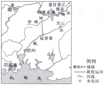 (2025 广东东莞期末) 2022 年 8 月 28 日, 广西平陆运河正式开工建设, 该运河起点为西津水库, 经钦江进入北部湾, 全长约 135 km, 全程落差 60 m。平陆运河建成后可通航 5000 t 级船舶出海, 结束“广西货物不走广西港”的历史。下图为平陆运河所在区域示意图。据此完成 4~5 题。