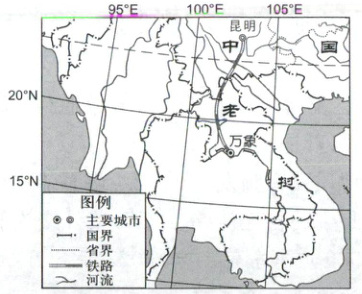 高频考点 (2025 山东济宁期末) 依托中老铁路 (下图), 云南省持续推进沿线物流枢纽、配套路网和园区专用线等配套基础设施建设, 积极将昆明打造成为中老班列的集结中心。2022 年 1 月, 中老铁路“澜湄快线”冷链列车开始运营, 来自东南亚的榴梿、山竹等热带水果运至昆明, 经昆明国际物流港集中分拨后发往全国。“澜湄快线”冷链列车的开行, 增强了东南亚热带水果在中国市场的竞争力。据此完成 6~8 题。