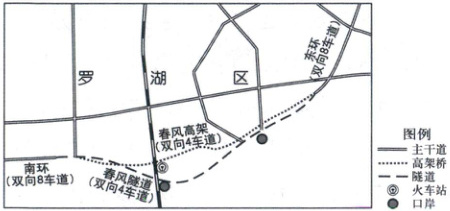 (1)题,本题“说明春风高架桥常年拥堵的原因”关键在于抓住材料中“春风高架桥是深圳环线快速路的重要组成部分”“东部居民向西钟摆式的通勤人数增长”等信息,再结合图中春风高架桥与主干道、火车站、口岸等交通节点的连接关系进行分析。第