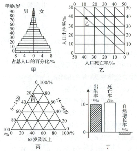 8.C 甲为人口金字塔图,塔基宽说明人口自然增长率高,并且甲地20岁以下人口占比超过28%,说明其自然增长率最高。乙地人口出生率与死亡率相等,人口自然增长率为0。丙地65岁及以上人口占比在5%左右,15~64岁人口占比在70%以上,0~14岁人口占比在25%左右,人口年龄结构呈成年型,说明人口自然增长率应低于甲,但高于乙。丁地人口自然增长率为负,为四地中最低。因此四地人口自然增长率从高到低依次为甲、丙、乙、丁。故选C。