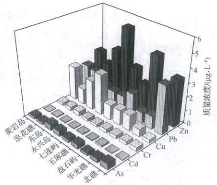 (2025 河南濮阳期末)海水中重金属超过一定质量浓度时会影响生物的生长发育和存活。某科研团队对我国南海中沙群岛的黄岩岛(位于南海航道要冲)和西沙群岛的永兴岛、七连屿、东岛、浪花礁、北礁、华光礁、盘石屿、玉琢礁等 9 个岛礁进行科学调查和采样,重点研究了重金属元素在礁区海水中的分布情况。下图示意调查海域各礁区重金属质量浓度。据此完成 9~10 题。