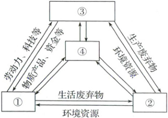 4. D 可持续发展复合系统包括三个子系统,其中社会系统为经济活动提供劳动力、科技,同时人类生产、生活废弃物排放到生态系统,故①为社会系统;经济系统为人类社会提供物质产品和资金等,同时工业活动生产废弃物排放到生态系统,故③为经济系统;生态系统提供环境资源给人类活动与经济活动,同时生产、生活的废弃物会进入环境系统,故②为生态系统。这些系统之间通过人的管理调控达到平衡,④为人的管理调控。生态环境保护督察的核心职能是监督、协调和规范经济、社会与生态系统的关系,确保三者平衡发展,属于人的管理调控,对应④。故选D。