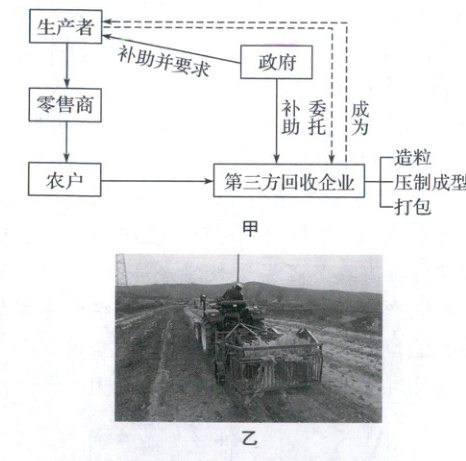 地膜即地面覆盖薄膜,厚度越薄,成本越低。当地膜厚度为 0.015~0.02 mm 时,综合效益最高,目前我国使用的地膜中约 50%不符合这一标准,回收利用难。下甲图示意内蒙古自治区某县基于全生命周期的地膜回收流程,乙图示意残膜捡拾回收机作业情景。据此完成 10~12 题。