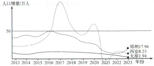 (易混易错(2025 浙江联考)下图是 2013—2023 年西安、郑州、太原等人口增量情况图。据此完成 10~11 题。