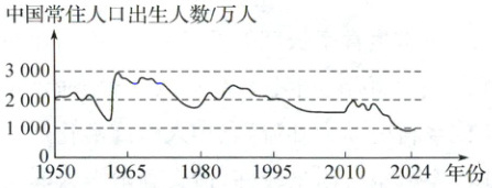 (2025 湖南联考)近几十年,我国人口经历了三个高增长阶段。1981—1990 年是我国第三个人口高增长阶段,之后人口增长进入平稳发展阶段,而近年来我国出生人口数量断崖式下降。随着城镇化进程发展,人口、产业往城镇化地区集聚,农村(县域)地区人口逐渐收缩。下图示意我国常住人口出生人数。据此完成 8~9 题。